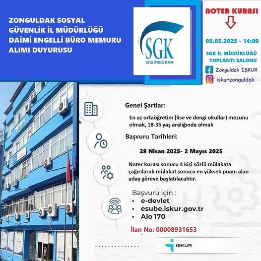SGK Zonguldak İl Müdürlüğü’ne engelli daimi büro memuru alımı yapılacak. İŞKUR üzerinden yayınlanan ilanda başvuru tarihlerinin 2 Mayıs’ta sona ereceği belirtildi.