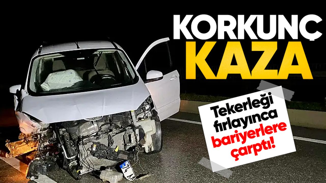 Amasra’dan Bartın istikametine seyir halinde olan hafif ticari araç, iddiaya göre tekerleğinin koparak fırlaması sonucu bariyerlere çarparak kaza yaptı.
