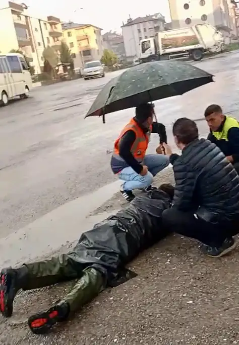 İş arkadaşları başında şemsiye ile sağlık ekipleri gelene kadar bekledi. Yaralanan personel, olay yerine çağrılan 112 Acil Sağlık ekiplerinin ilk müdahalesinin ardından ambulansla hastaneye kaldırıldı.