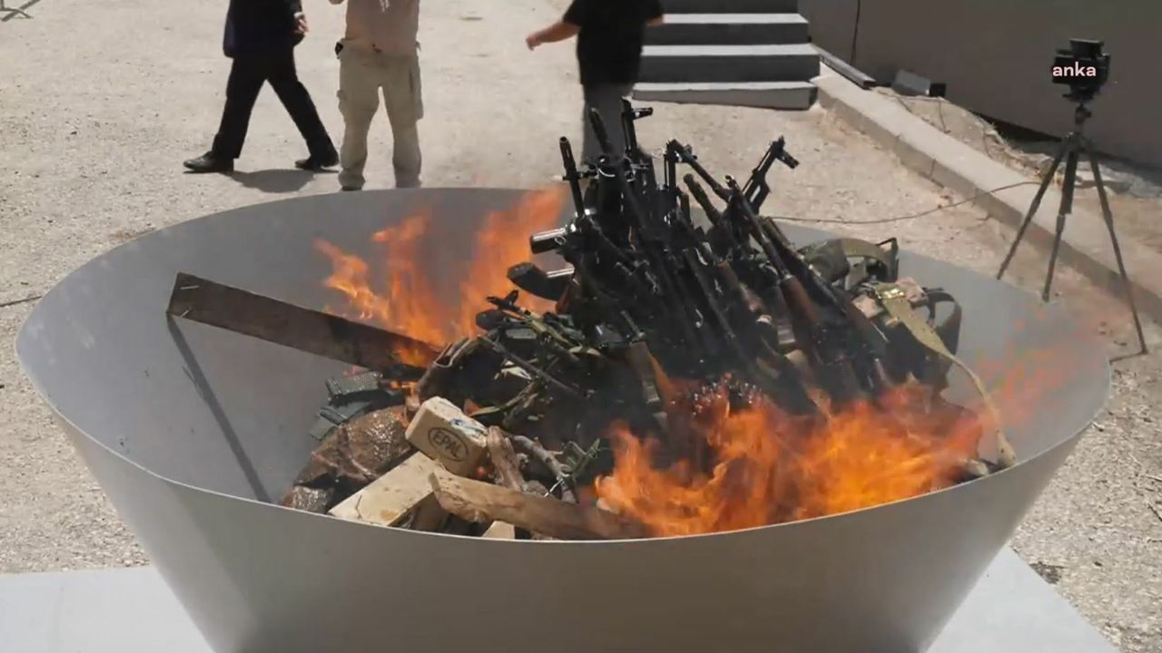 Terör örgütü PKK’nın fesih kararı ve Öcalan’ın silah bırakma çağrısı sonrası KCK Eş Başkanı Bese Hozat’ın da aralarında bulunduğu 30 örgüt mensubunun dün Süleymaniye kentindeki Casene Mağarası’nda düzenlenen törenle yaktıkları silahların aynı bölgede muhafaza edileceği bildirildi.