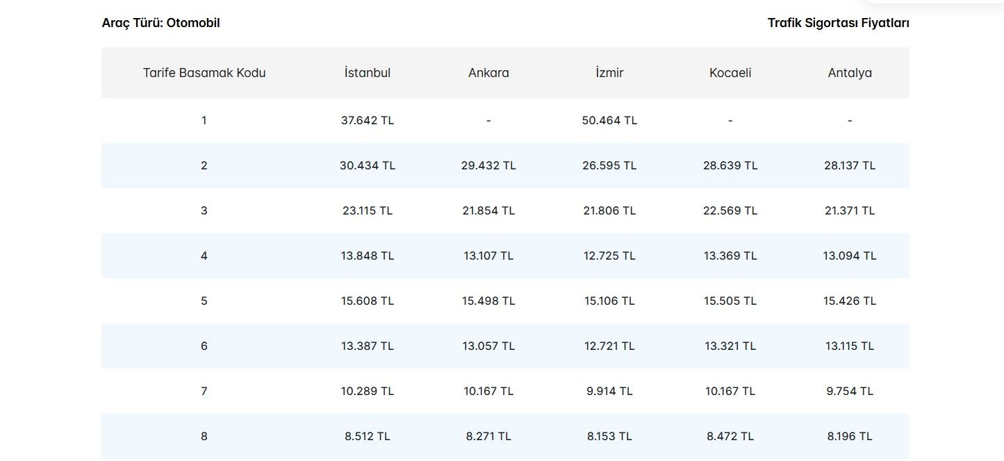 TRAFİK SİGORTASI FİYAT TABLOSU