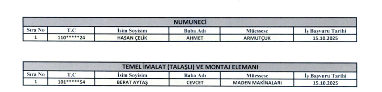 “Kurumumuzun yerüstü işyerlerinde 4857 Sayılı İş Kanununa tabi daimi işçi statüsünde çalıştırılmak üzere işe alınacak olan toplam 132 nitelikli işçi alımı için Zonguldak 1. Noteri tarafından 24.10.2024 ve 20.12.2024 tarihlerinde yapılan kura çekimleri sonucunda işe girmeye hak kazanan adayların içinde, İlk İşe Giriş Sağlık Rapor sonuçları “ÇALIŞIR” olan ve Arşiv Araştırma sonuçlarına göre işe başlamaya engel durumu olmayan 2 işçi adayının çalışacağı işyerleri belirlenmiş olup 15.10.2025 tarihinde ilgili müessese ve İşletme Müdürlüklerine başvuracaklardır.