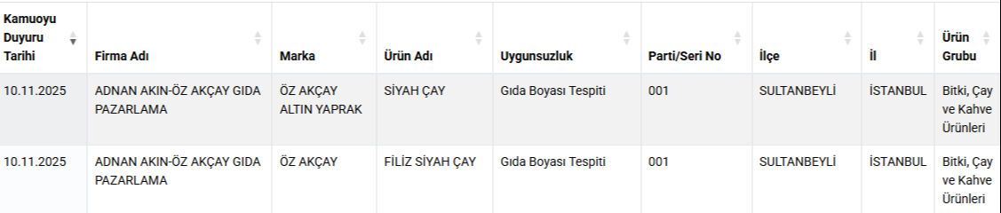 Bakanlığın son güncellediği listede İstanbul'da Adnan Akın-Öz Akçay Gıda Pazarlama firmasına ait Öz Akçay Altın Yaprak siyah çayda ve yine aynı firmaya ait Öz Akçay marka filiz siyah çayda da gıda boyası tespit edildi.