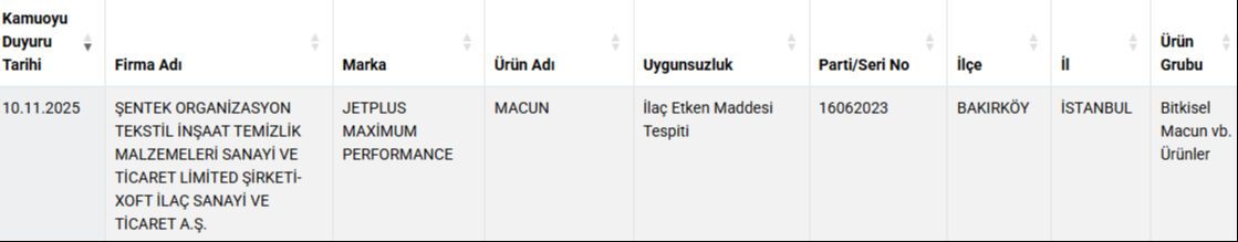 Şentek Organizasyon Tekstil İnşaat Malzemeleri Sanayi ve Ticaret Limited Şirketi - Xoft İlaç Sanayi ve Ticaret A.Ş.'ye ait Jetplus Maximum Performance marka macunda sağlığı tehlikeye düşürecek ilaç etken maddesi tespit edildiği bildirildi.