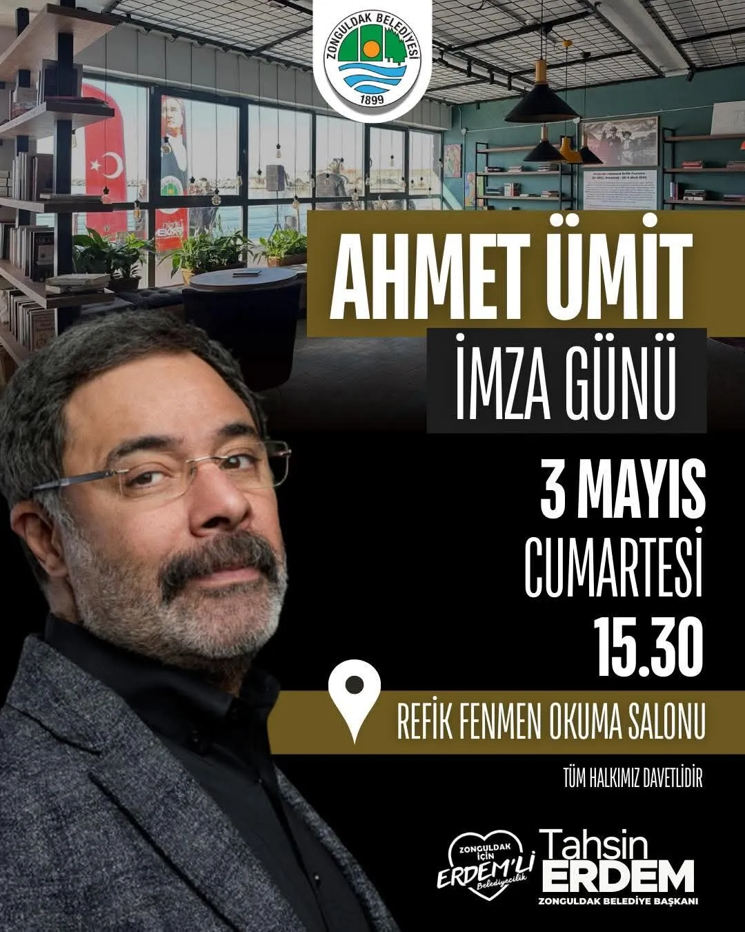 Zonguldak Belediyesi 3 Mayıs Cumartesi günü Usta yazar Ahmet Ümit için tanışmak ve kitaplarını imzalatmak isteyen tüm halkı Refik Fenmen Okuma Salonuna davet etti.