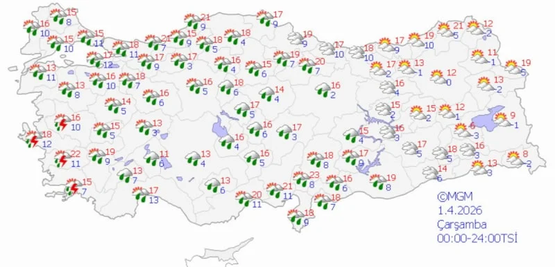 Bugün ülke genelinde çok bulutlu bir hava hakim olacak. Özellikle Marmara'nın doğusu, İç Ege, İç Anadolu'nun batısı, Batı ve İç Akdeniz ile bazı Doğu Anadolu çevrelerinde yerel olarak kuvvetli yağmur ve sağanak yağışlar görülecek.