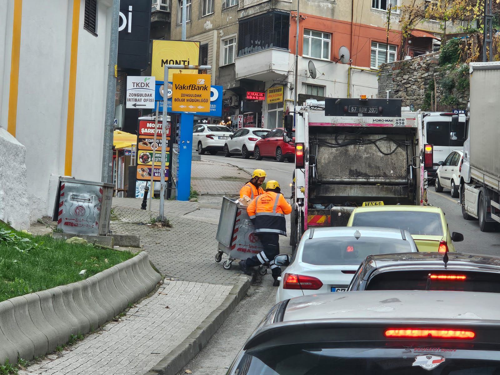 Zonguldak Belediyesi Temizlik işçileri tarafından konteynırlardan toplanan çöpler yoğun olan trafiği iyice felç etti. Ekiplerin dakikalarca çöp toplamasını bekleyen araç sürücüleri kornalara basarak tepki gösterdi.
