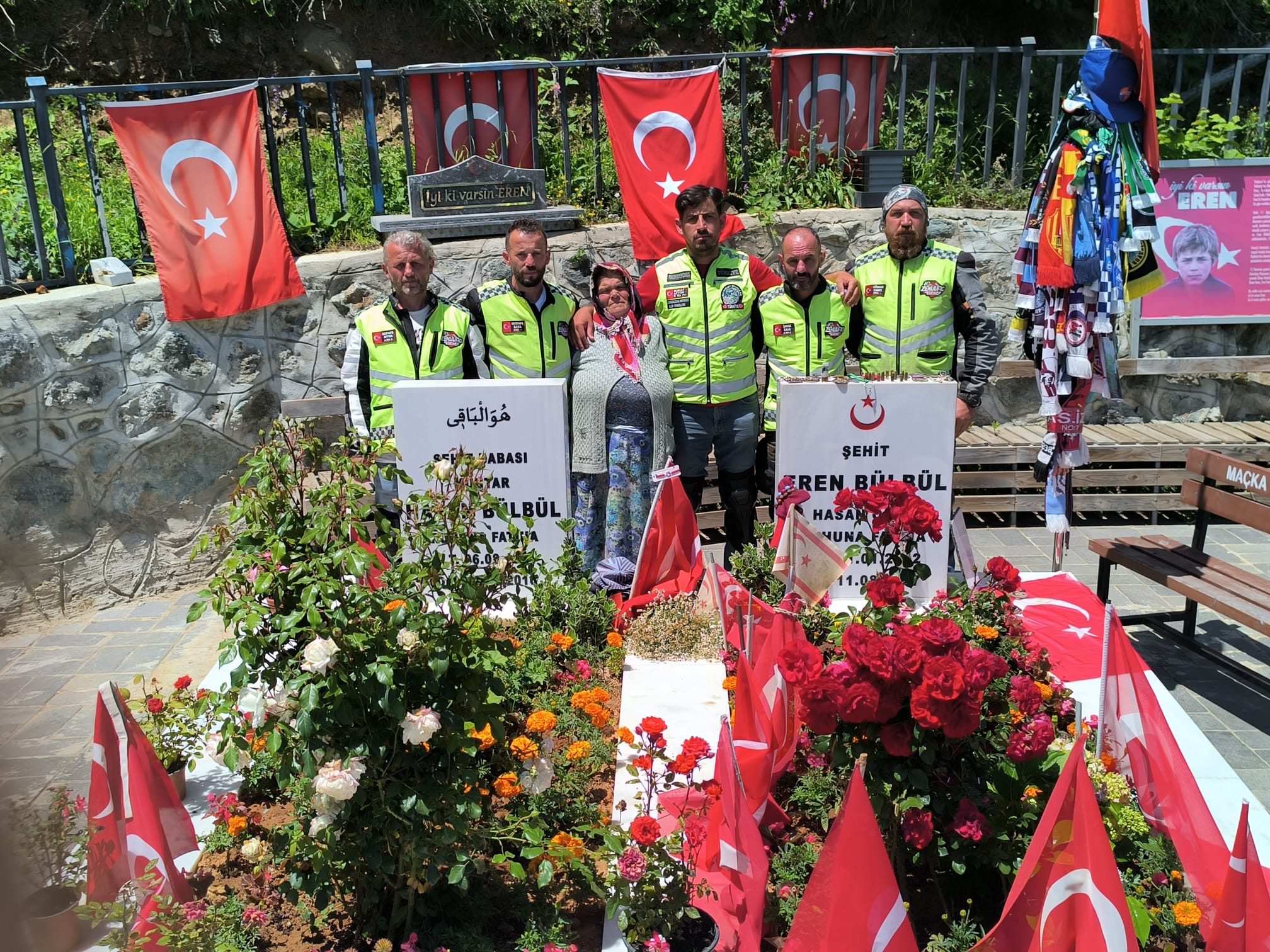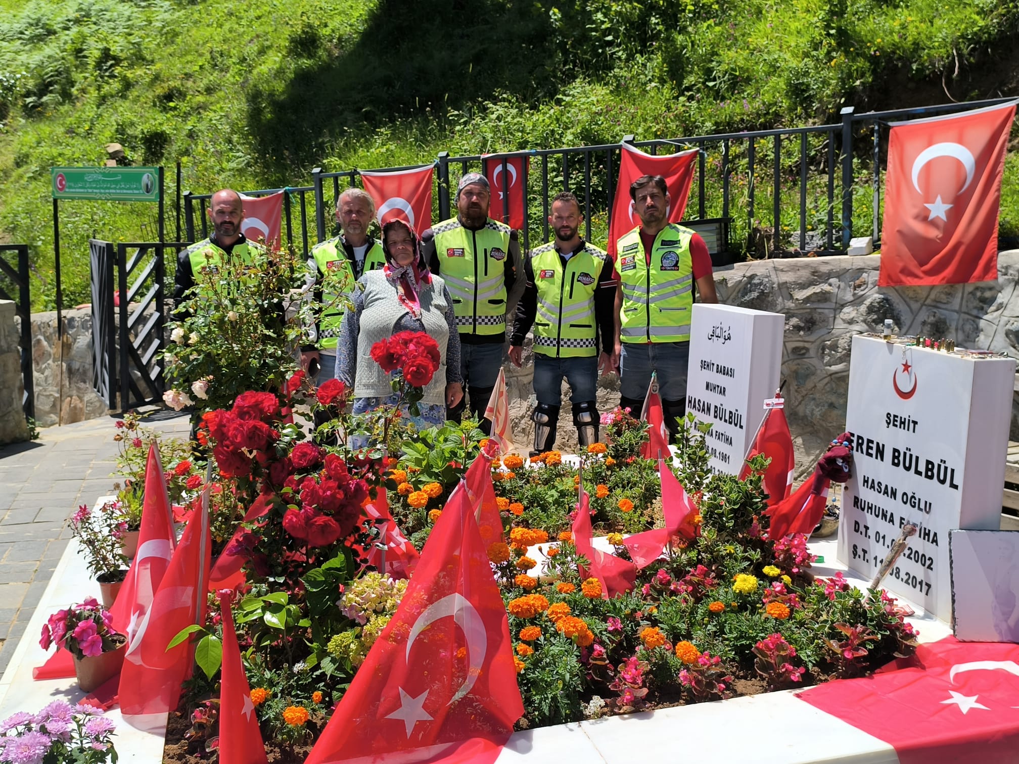 Zonguldak’ta faaliyet gösteren Zenduro Enduro Grubu, anlamlı bir yolculuğa imza atarak Şehit Eren Bülbül’ün Trabzon’daki kabristanını ziyaret etti. Mustafa Afyon, Gürhan Camcı, Mustafa Kaya, Şafak Kaya ve Murat Afyon’un yer aldığı motorcu ekibi, Şehidimiz Eren Bülbül’ün mezarı başında dualar okuyarak onun aziz hatırasını andı.