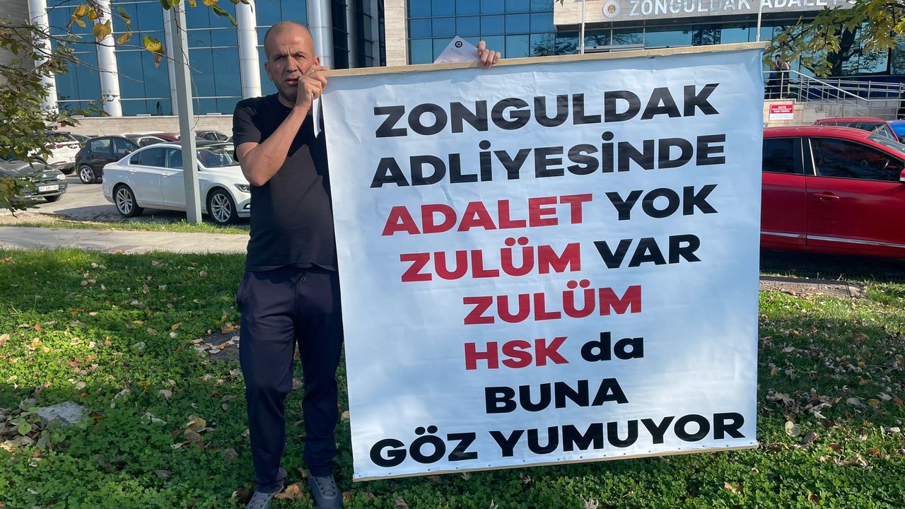 Zonguldak Adliyesi önünde elinde “Zonguldak adliyesinde adalet yok, zulüm var zulüm” yazılı pankartla açıklama yapan Güneş, şu ifadeleri kullandı: