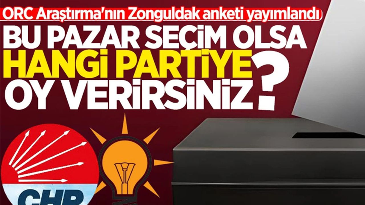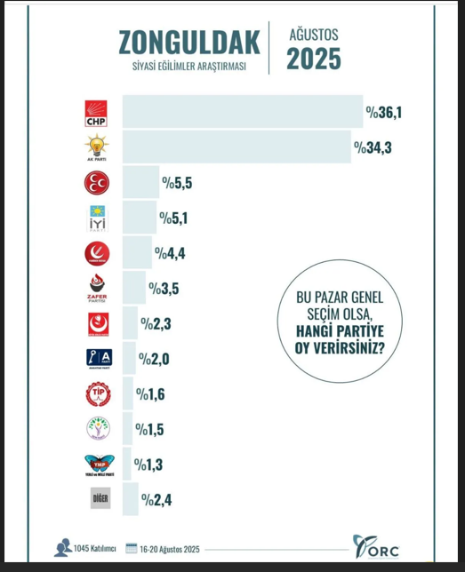 ORC Araştırma şirketi, Zonguldak’ta bin 1045 vatandaşın katılımı ile bir anket yaptı. 16-20 Ağustos 2025 tarihleri arasında yapılan ankette vatandaşlara "Bu pazar genel seçim olsa hangi partiye oy verirsiniz?" sorusu yöneltildi.