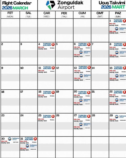 Zonguldak Havalimanı, Mart ayında yapılacak uçuş programını açıkladı.