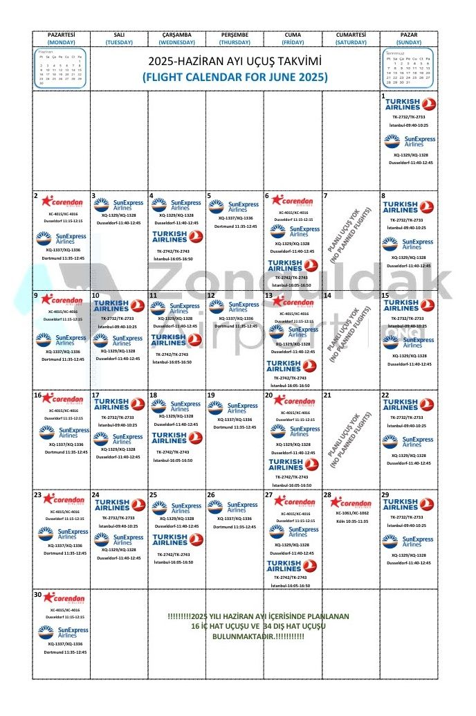 Zonguldak Havalimanı'nın 2025 yılı Mayıs ayı uçuş programı açıklandı.