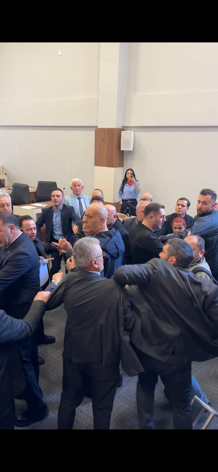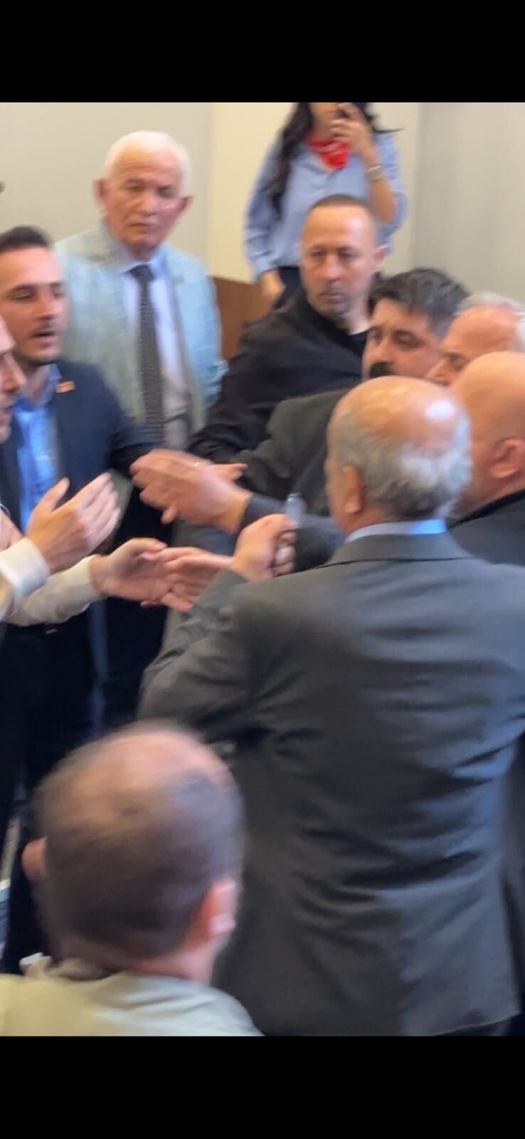 İtirazların tartışmaya dönüşmesiyle birlikte salonda tansiyon doruk noktasına ulaştı. Sözlü tartışmanın fiziksel temasa dönüşmesi üzerine meclis üyeleri birbirine girdi. Güvenlik birimlerinin müdahale etmekte zorlandığı arbede nedeniyle oturuma ara verildi.