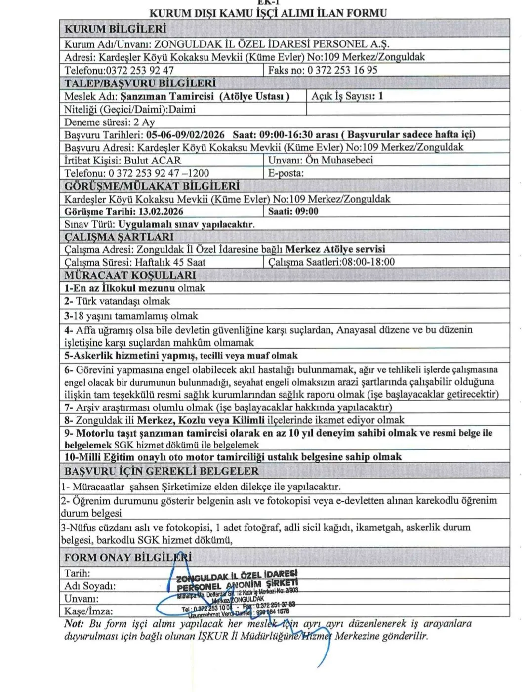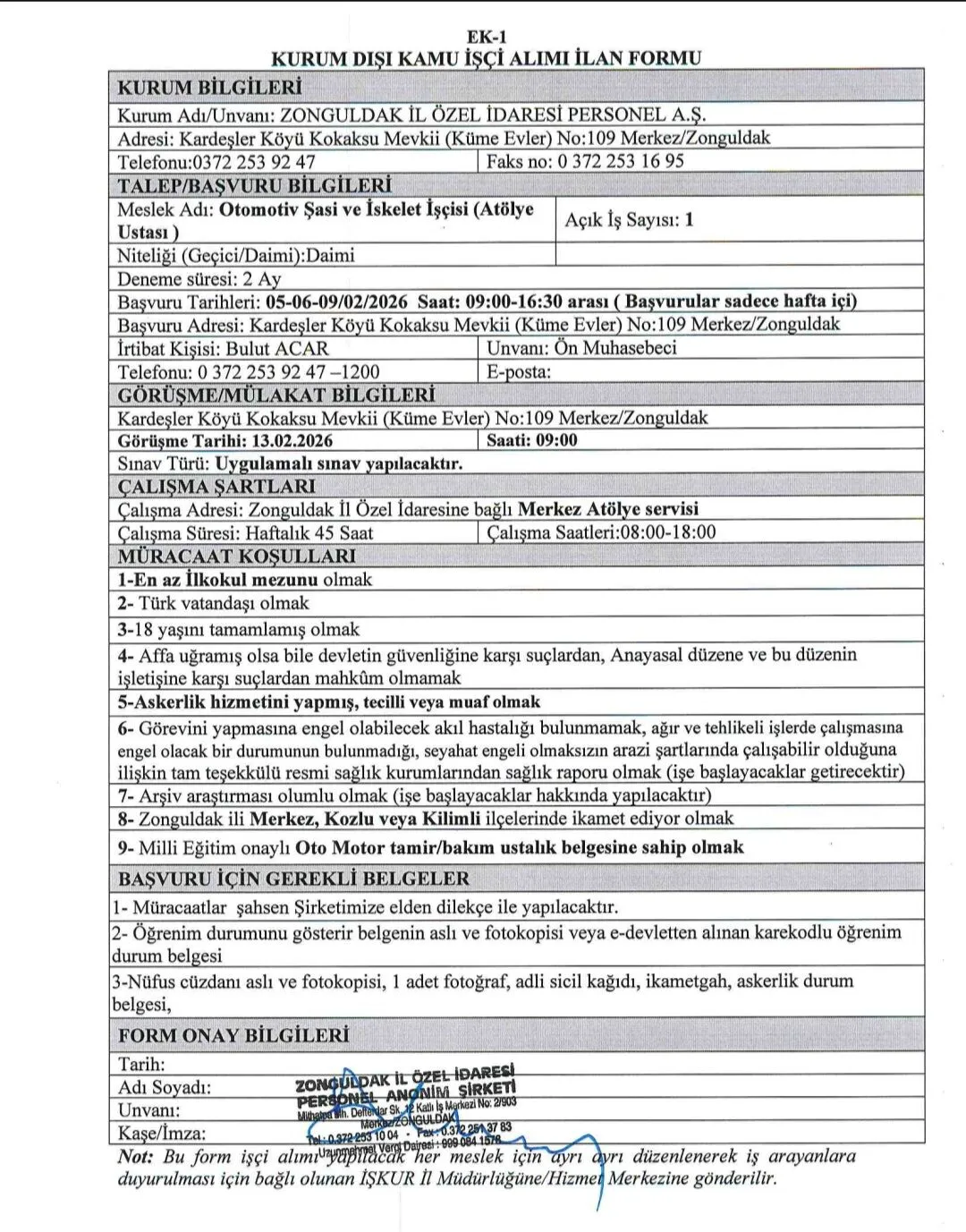 Zonguldak İl Özel İdare Müdürlüğü bünyesinde çalıştırılmak üzere İŞKUR üzerinden 1 şanzıman tamircisi (atölye ustası) 1 otomotiv şaşi ve iskelet işçisi alınacak.