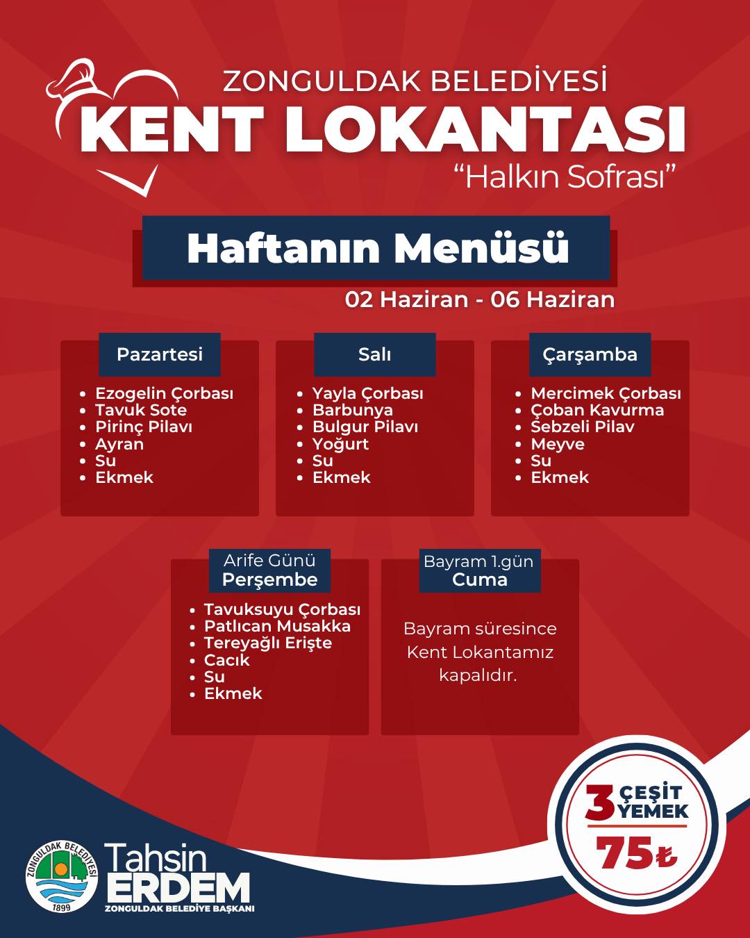 Zonguldak Kent Lokantası’nda 02 - 06 Haziran haftasının menüsü belli oldu. Haftanın 5 günü hizmet veren kent lokantasında vatandaşlar 3 tabak yemeği 50 liradan yeme fırsatı buluyor.