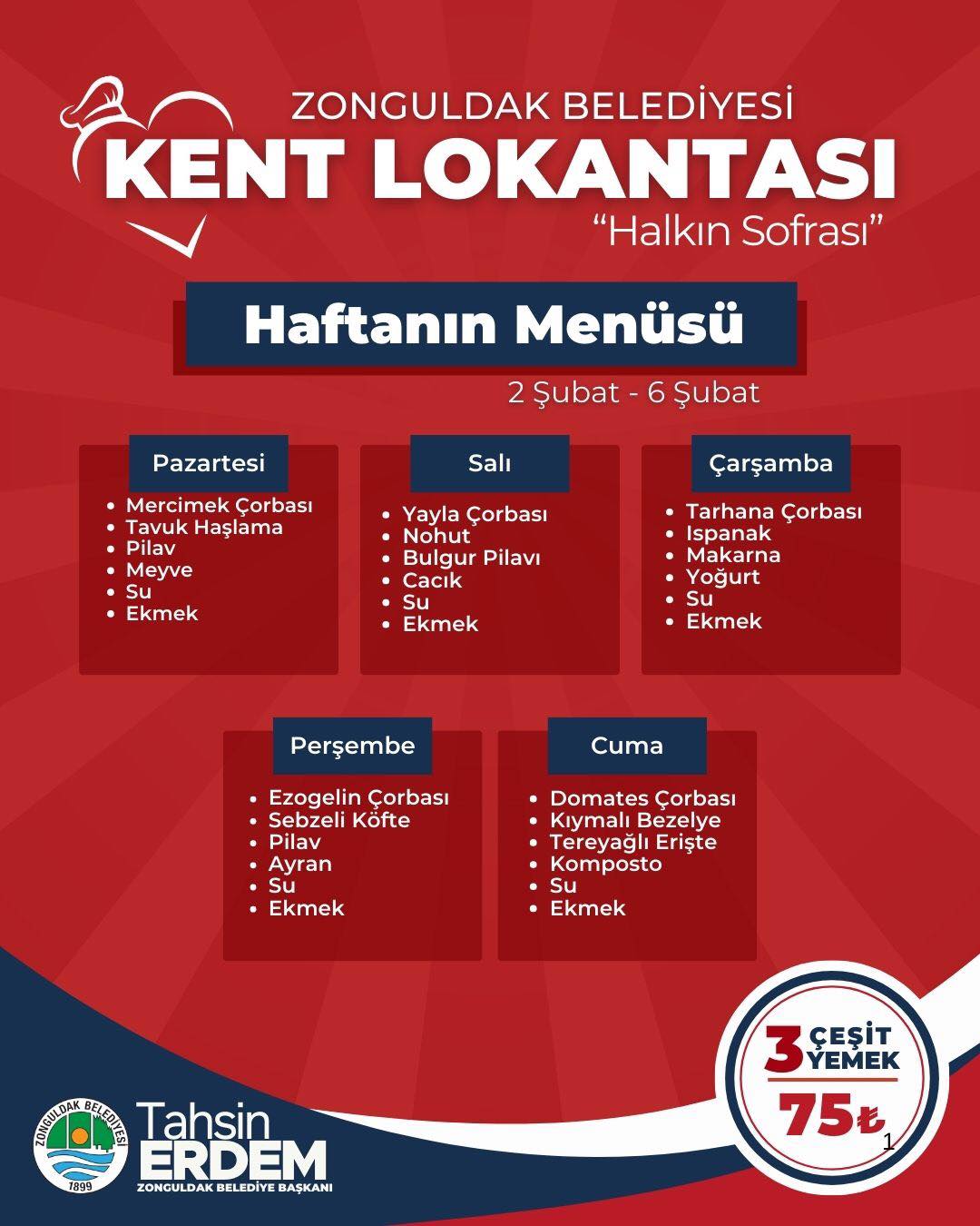 Zonguldak Kent Lokantası’nda İşte 2-6 Şubat haftasının menüsü belli oldu. Haftanın 5 günü hizmet veren kent lokantasında vatandaşlar 3 tabak yemeği 75 liradan yeme fırsatı buluyor.