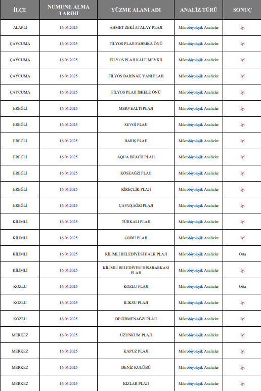 Halk Sağlığı Hizmetleri Başkanlığı Çevre Sağlığı ekiplerinin almış olduğu su numuneleri ile ilgili olarak bir açıklama yapan Zonguldak İl Sağlık Müdür Vekili Dr. Bilal Cin yapmış olduğu açıklamada şöyle dedi. “ Tatile çıkmak isteyen vatandaşlarımız yuzme.saglik.gov.tr adresinden buradaki tüm plajlarla ilgili bilgilere ulaşabilir. . Bu siteden, plajın kum ya da çakıl olup olmadığı, konumu, derinliği, sahil uzunluğu, engelli erişimi, otopark durumu, kamp alanı olup olmadığı gibi birçok bilgiye ulaşılabiliyor. Aynı zamanda mükemmel, iyi orta ve kötü sınıflandırması içerisinde alınmış olan numunelerin birebir sonuçlarını tüm şeffaflığıyla yıllara göre görülebiliyor. En yakın sağlık kuruluşu, hangi sağlık kuruluşuna yakın bilgisi de yer almakta olduğunu ifade eden Dr. Bilal Cin, “