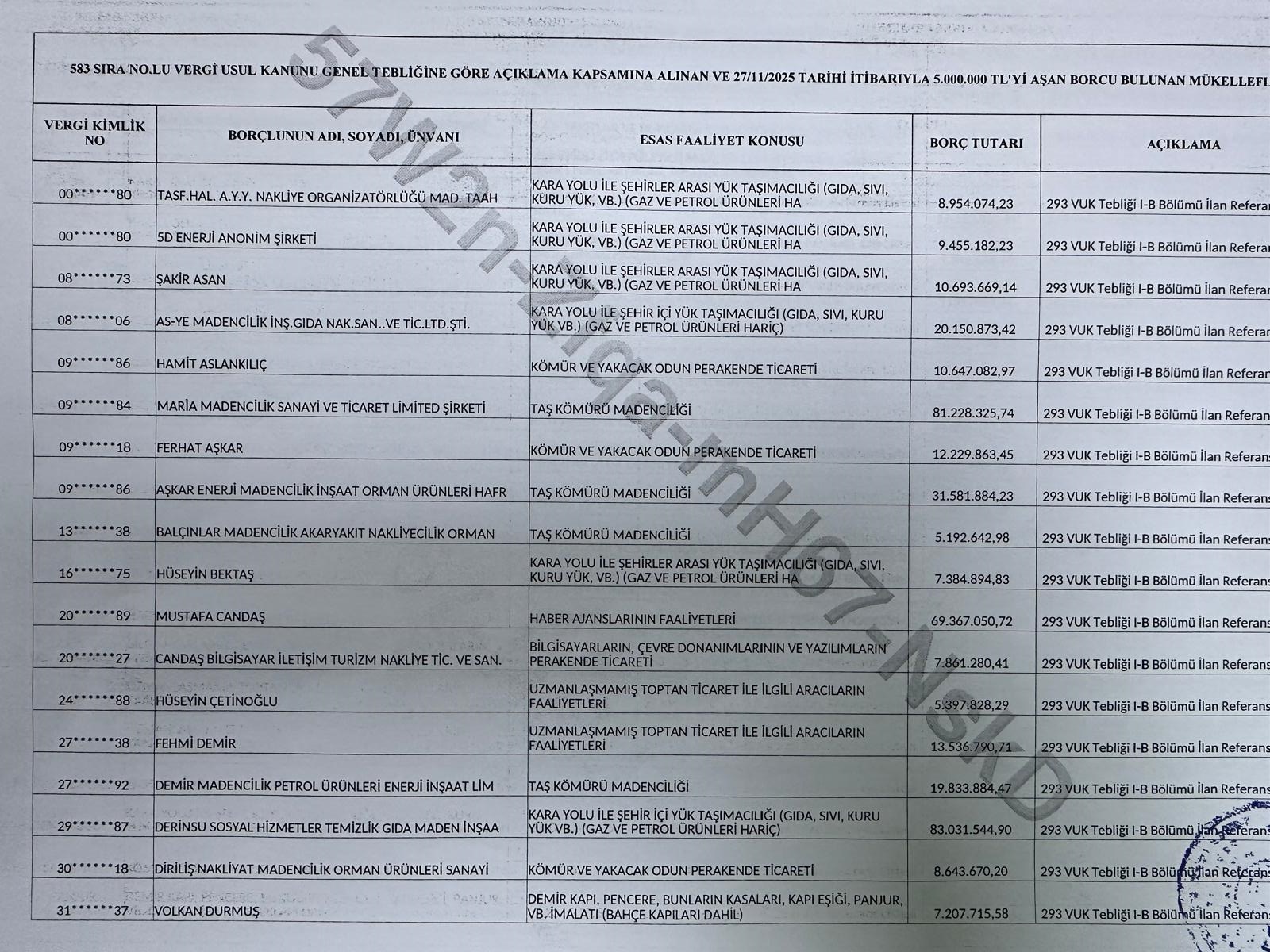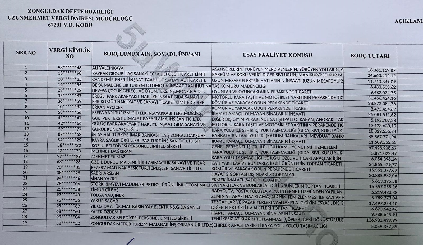 Zonguldak Defterdarlığı, 25 Kasım 2025 itibarıyla kentte 5 milyon liranın üzerinde kesinleşmiş vergi ve ceza borcu bulunan mükelleflerin isim listesini kamuoyuna açıkladı.