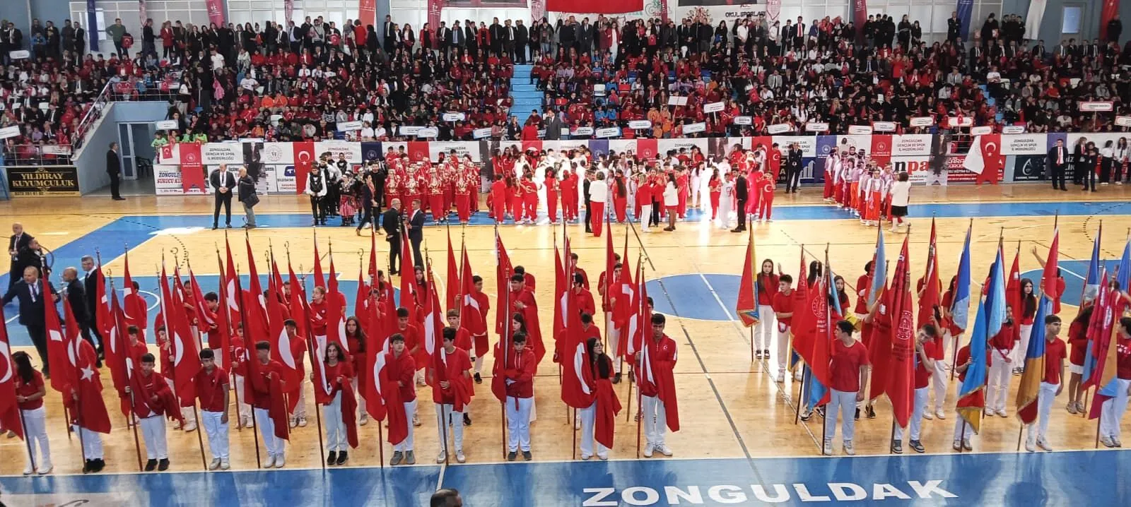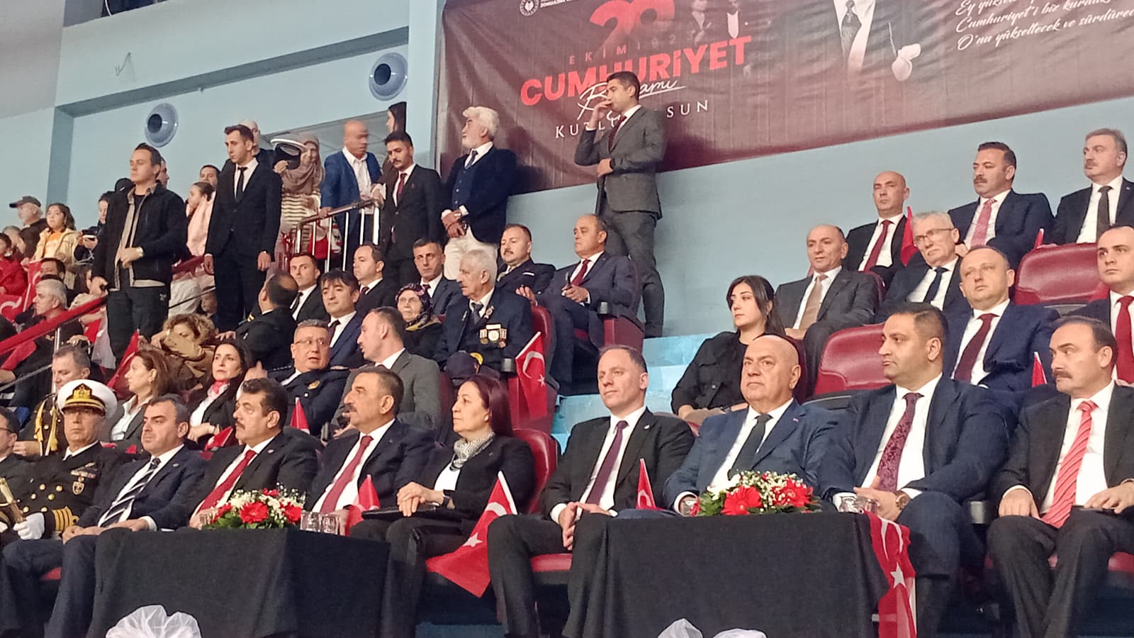 Zonguldak’ta 29 Ekim Cumhuriyet Bayramı kutlamaları, Site Kapalı Spor Salonu’nda gerçekleştirildi. Vali Osman Hacıbektaşoğlu ve eşi Güney Hacıbektaşoğlu’nun katıldığı törende,CHP Genel Başkan Yardımcısı Deniz Yavuzyılmaz, AK Parti Zonguldak Milletvekili Ahmet Çolakoğlu, AK Parti Milletvekili Muammer Avcı, Zonguldak Belediye Başkanı Vekili Adil Bahadır, Cumhuriyet Başsavcısı Gökhan Kapağan, İl Emniyet Müdürü Sinan Ergen ve İl Jandarma Komutanı Alay Barış Cücen ile çok sayıda siyasi parti temsilcisi, öğrenci grupları ve vatandaşlar katıldı.