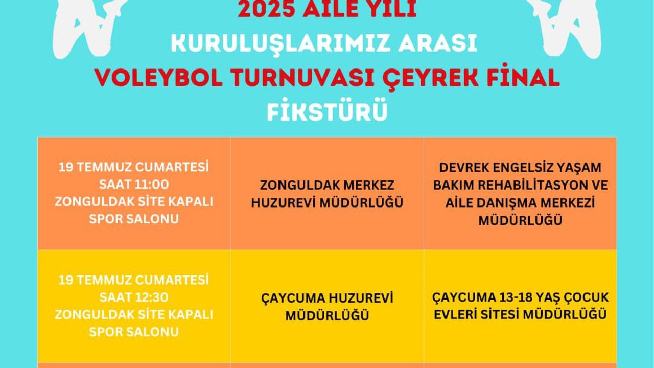Zonguldak'ta Aile ve Sosyal Hizmetler İl Müdürlüğü tarafından düzenlenen 2025 Aile Yılı Kuruluşlar Arası Voleybol Turnuvası'nın çeyrek final maçları, 19-20 Temmuz tarihlerinde Zonguldak Site Kapalı Spor Salonu'nda oynanacak.