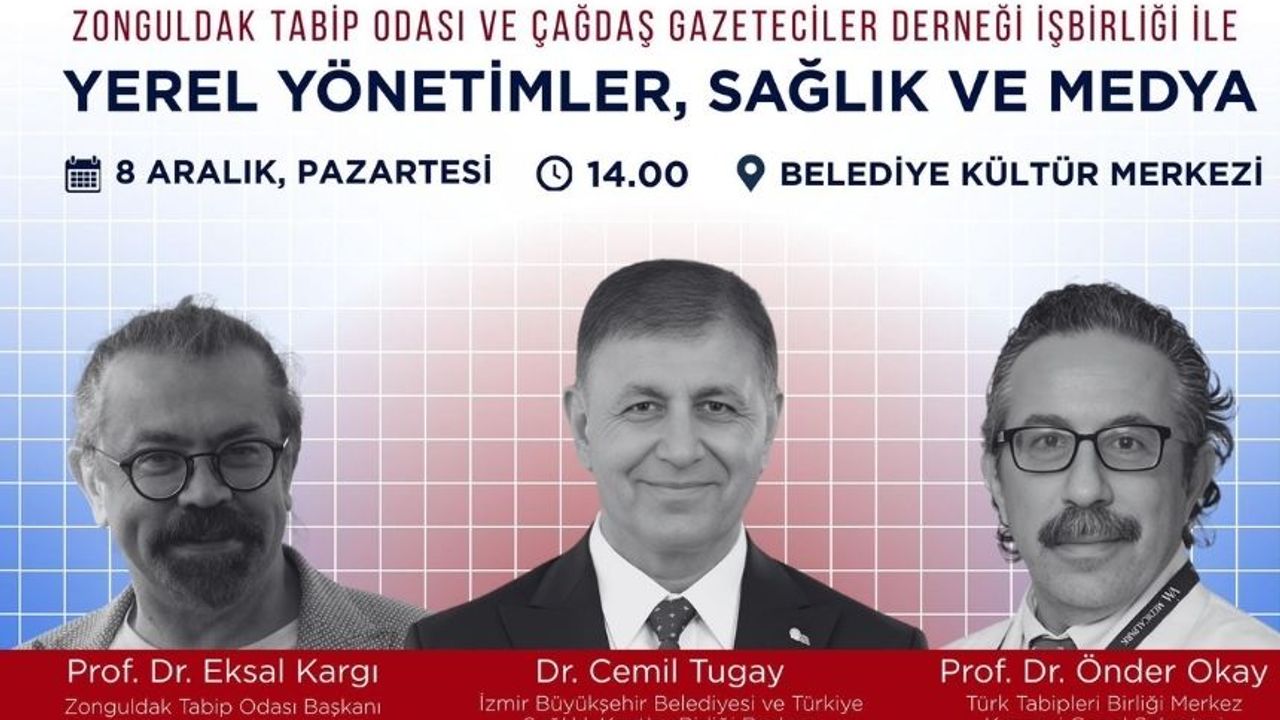 Zonguldak Tabip Odası ile Çağdaş Gazeteciler Derneği’nin ortaklaşa gerçekleştirdiği “Yerel Yönetimler, Sağlık ve Medya” konulu panel, 8 Aralık Pazartesi günü Zonguldak Belediyesi Kültür Merkezi’nde yapılacak. Panelde, İzmir Büyükşehir Belediye Başkanı ve Türkiye Sağlıklı Kentler Birliği Başkanı Dr. Cemil Tugay, Zonguldak Tabip Odası Başkanı Prof. Dr. Eksal Kargı ile Türk Tabipleri Birliği Merkez Konseyi Genel Sekreteri Prof. Dr. Önder Okay konuşmacı olarak yer alacak. Etkinlik 14.00’te başlayacak ve halka açık olacak.