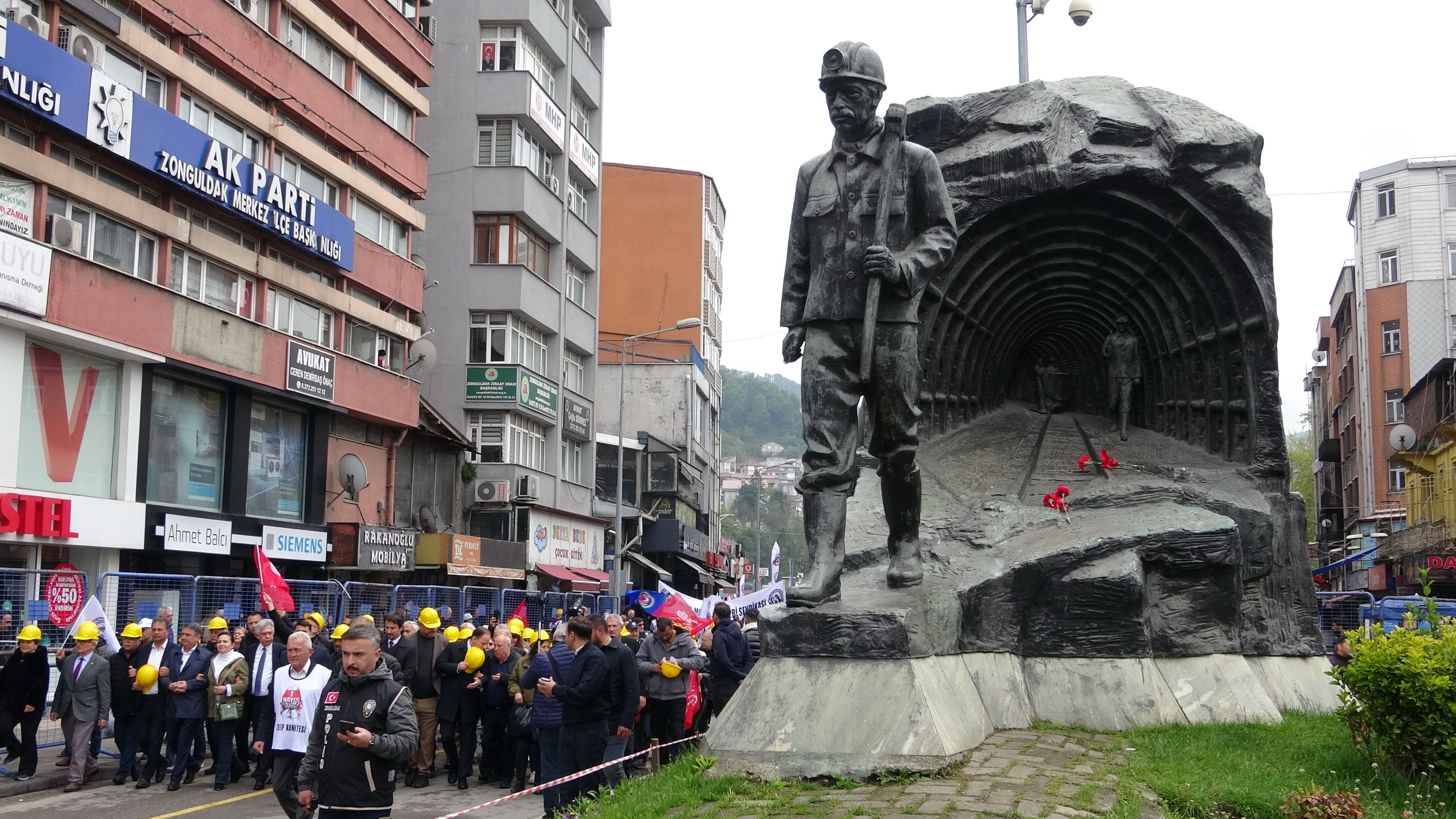 1 Mayıs Emek ve Dayanışma Günü kutlamaları İstasyon Caddesi önünde başladı. Toplanan kalabalık Madenci Anıtı önüne kadar yürüdü. Yürüyüş sırasında bir işyerinin ikinci katındaki işçiler demir kaynağı yaparak çalıştı. Çalışırken de korteji izledi. Madenci Anıtı'nda toplanan kalabalık saygı duruşunda bulunulmasının ardından İstiklal Marşı okudu. Bir kişi elindeki trompeti ile müziklere eşlik ederken küçük bir kız çocuğu da giydiği madenci kıyafeti ve bareti ile poz verdi.