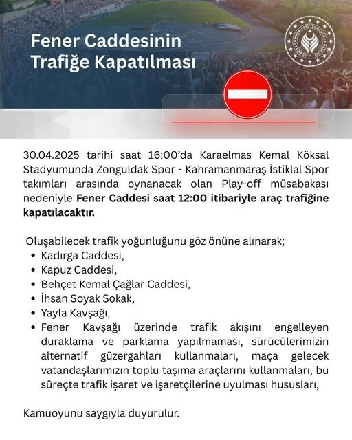 Valilikten yapılan açıklamada saat 12.00 itibari ile Fener Caddesinin trafiğe kapatılacağı, bölgede kesinlikle hatalı parka izin verilmeyeceği bildirildi.