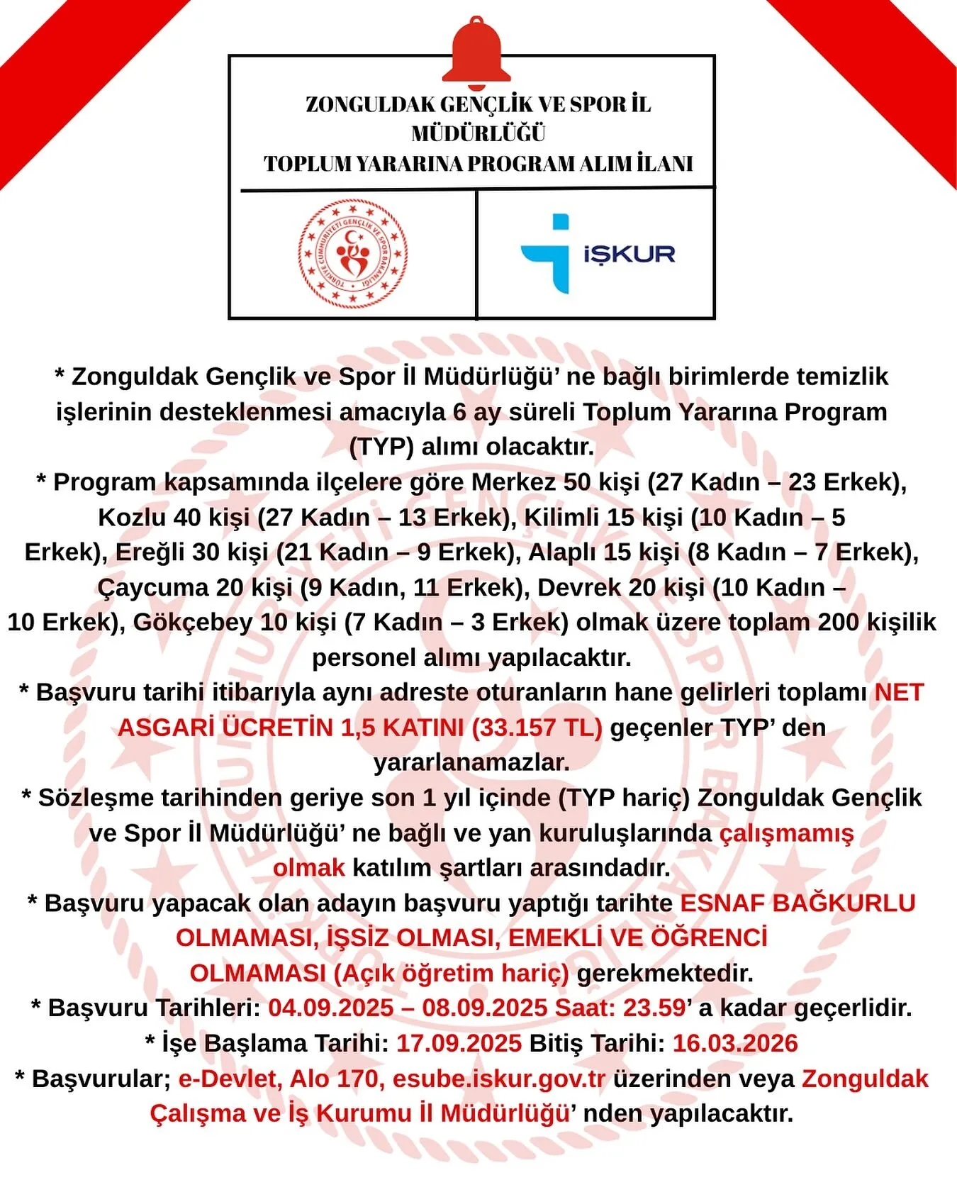 TYP (Toplum Yararına Program) kapsamında İŞKUR İl Müdürlüğü tarafından Zonguldak Gençlik ve Spor İl Müdürlüğü’ne merkez ve ilçeler olmak üzere 6 ay süreli 200 personel alımı yapılacak.