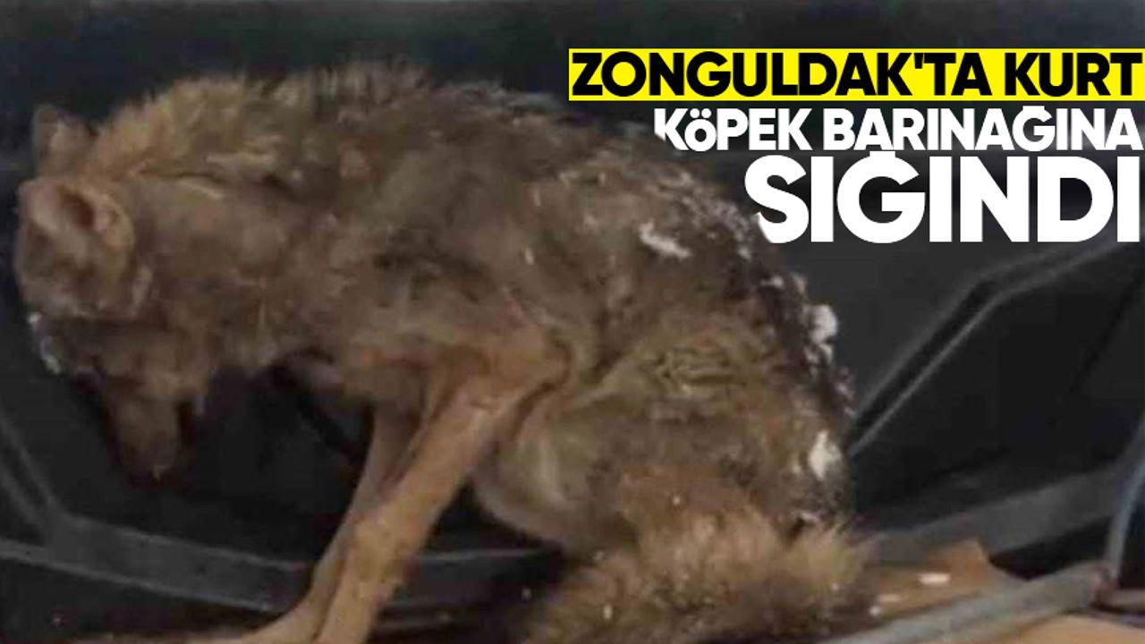 Zonguldak’ın Alaplı ilçesine bağlı Aydınyayla köyünde, etkili olan kar yağışı nedeniyle yiyecek bulmakta zorlanan bir kurt, bir köpek barınağına sığınmış halde bulundu.