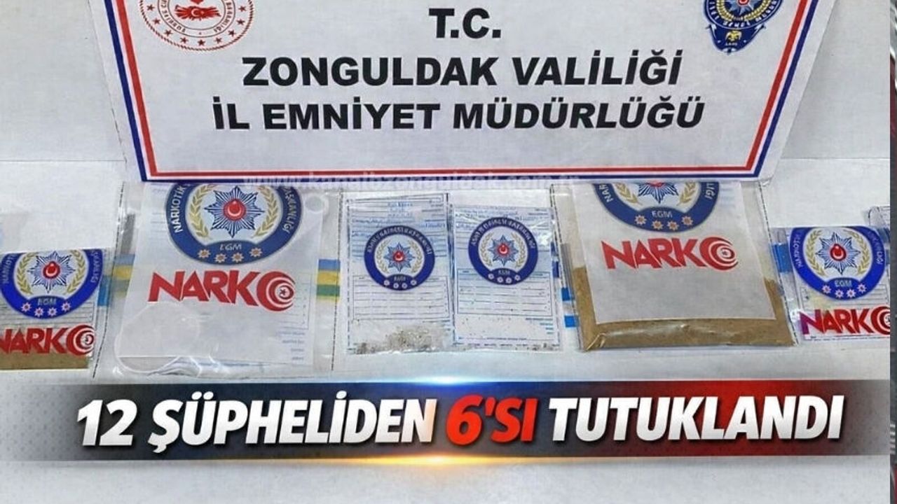 ZONGULDAK’ta İl Emniyet Müdürlüğü ekiplerince kent merkezi ile Kilimli ilçesinde düzenlenen narkotik operasyonunda gözaltına alınan 12 şüpheliden 6’sı tutuklandı. Edinilen bilgiye göre, polis ekipleri uyuşturucuyla mücadele kapsamında merkez ve Kilimli’de eş zamanlı operasyon gerçekleştirdi. Operasyonda 12 şüpheli yakalanırken, adreslerde yapılan aramalarda 183 gram sentetik uyuşturucu, 2 gram esrar, 1 hassas terazi ile 1 uyuşturucu kullanma aparatı ele geçirildi. Gözaltına alınan şüphelilerden 5’i hakkında “uyuşturucu veya uyarıcı madde kullanmak” suçundan adli işlem yapıldı. “Uyuşturucu veya uyarıcı madde ticareti yapmak” suçlamasıyla adliyeye sevk edilen şüphelilerden Ö.B. adli kontrol şartıyla serbest bırakıldı. Şüphelilerden T.Ö., V.K., Ö.K., T.B., Ş.K. ve B.Y. ise çıkarıldıkları mahkemece tutuklanarak cezaevine gönderildi.