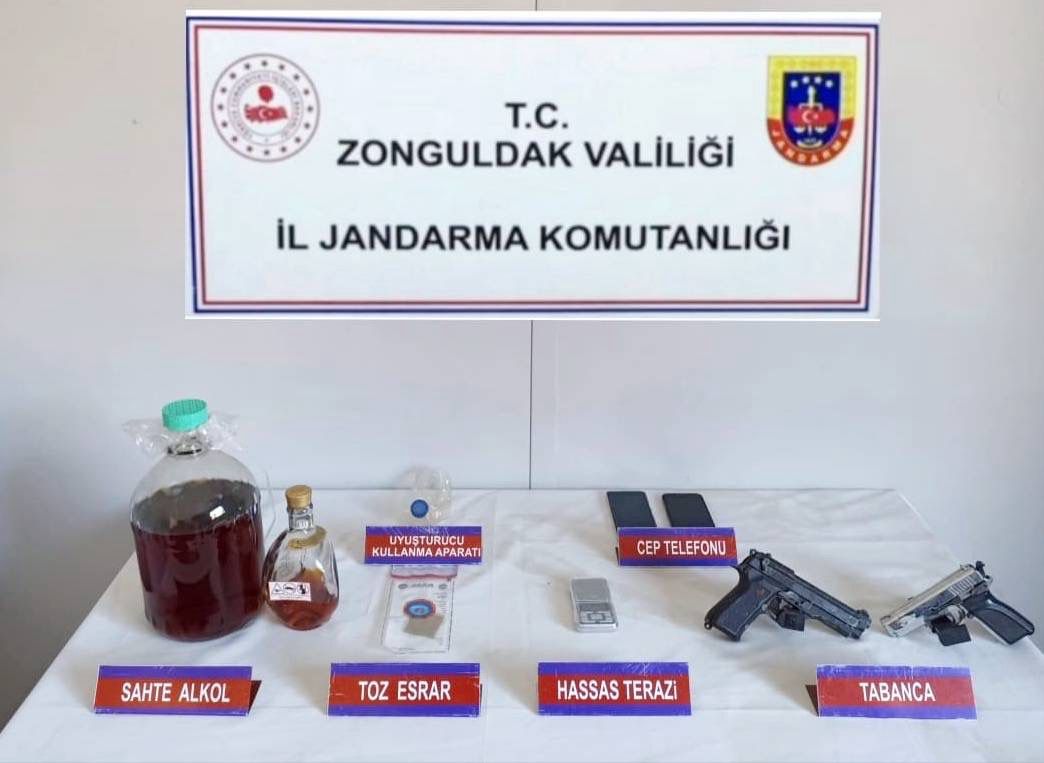 Devrek’te Jandarma Komutanlığınca arama kararı bulunan 5 ayrı adrese operasyon düzenlendi. Operasyonda 7 Gr. Toz Esrar, 1 Adet Hassas Terazi, 1 Adet Uyuşturucu Kullanma Aparatı, 6 Litre Sahte Viski, 2 Adet Ruhsatsız Tabanca, ele geçirildi.