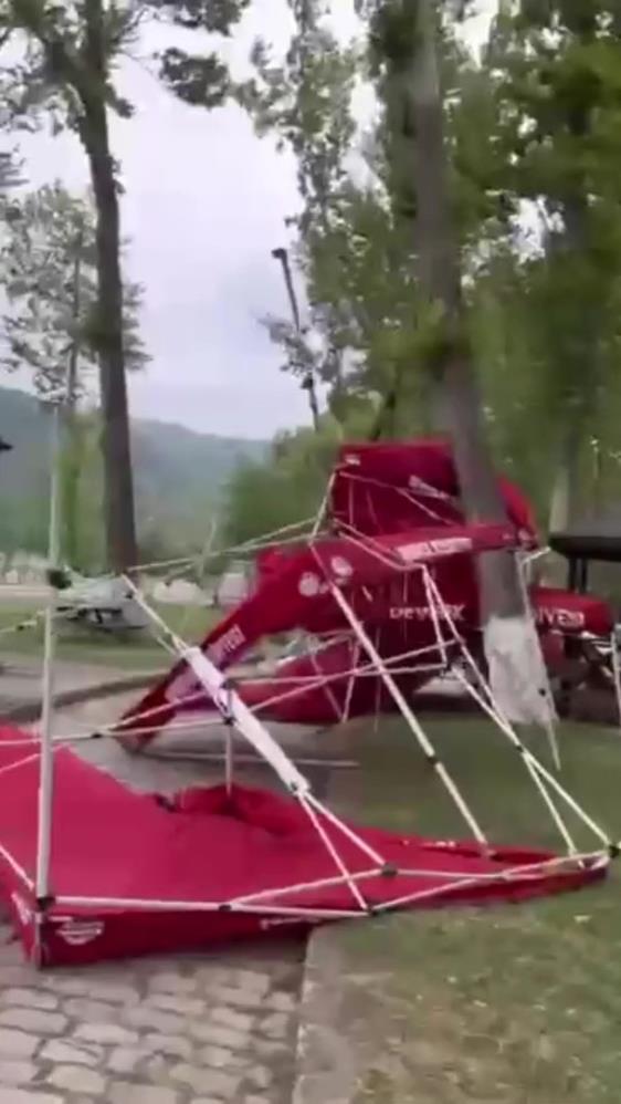 Vatandaşlar rüzgarlı havalarda dikkatli olmaları konusunda uyarıldı. Öte yandan rüzgar sebebiyle Devrek Belediyesi'ne ait tenteler de devrildi.
