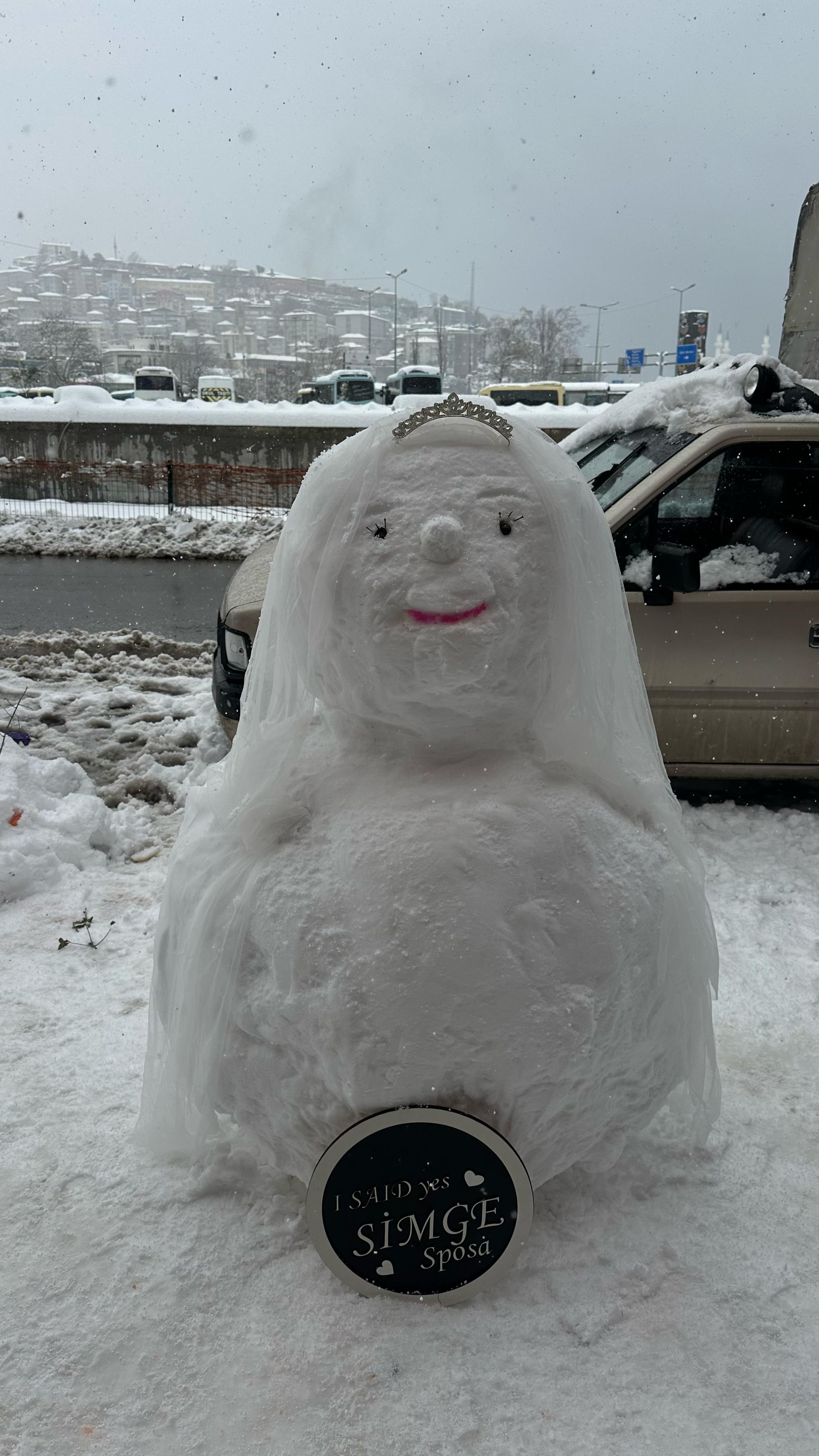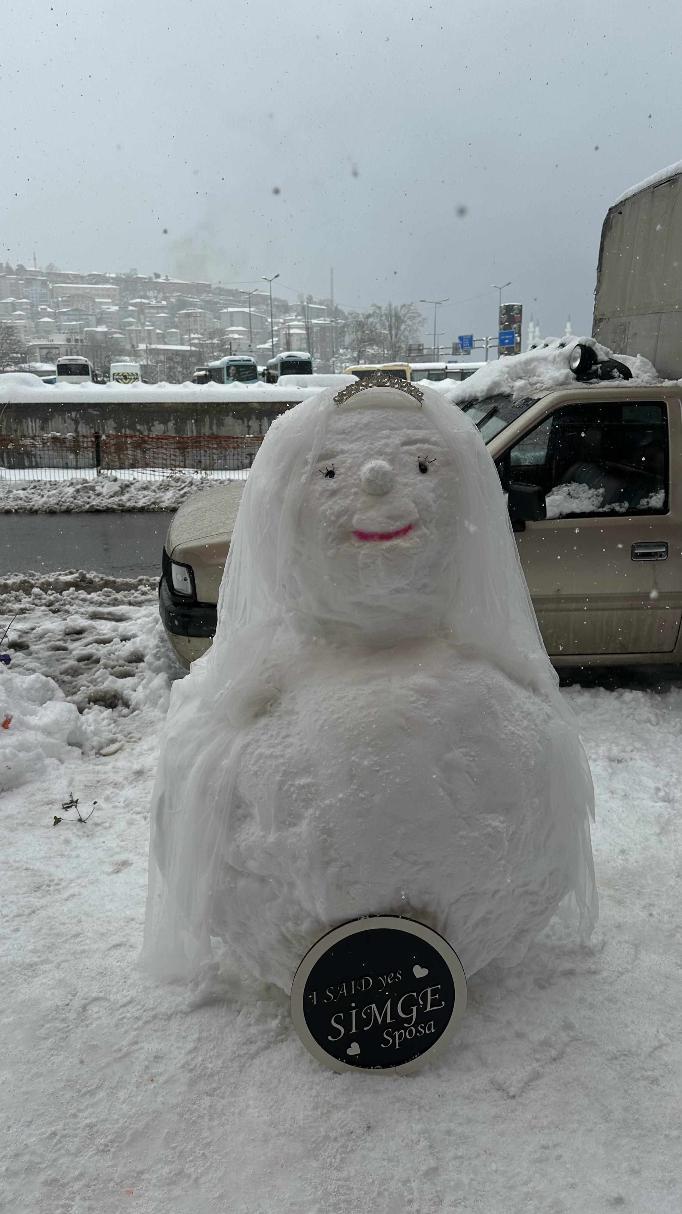 Mağaza çalışanları, klasik kardan adam yapmak yerine, işlerine de gönderme yaparak kardan gelin yaptı. Özenle şekillendirilen ve duvak eklenen kardan gelin, kısa sürede çevredeki vatandaşların ilgisini çekti. Önünden geçenler hem şaşkınlık hem de hayranlıkla bu yaratıcı fikri inceledi. Vatandaşlar kardan gelinin önünde hatıra fotoğrafı çektirerek bu eğlenceli anı ölümsüzleştirdi.